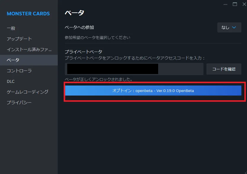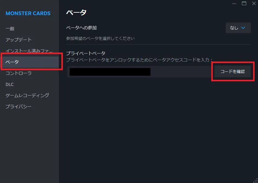 ベータタブを開き、アクセスコードを入力、コードを確認を押します。