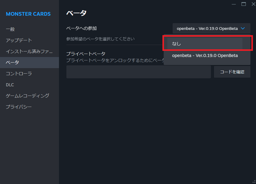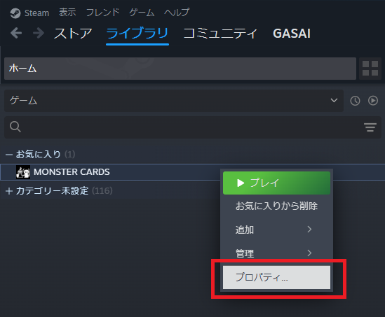 SteamのライブラリでMONSTER CARDSを右クリック、プロパティを押します。